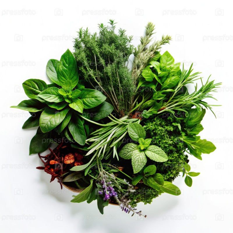 Вид сверху ярких трав, расположенных в круговой форме на белом фоне
