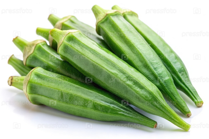 Свежие луковицы окра изолированы на белом фоне, демонстрируя их яркий зеленый цвет и отличительную форму