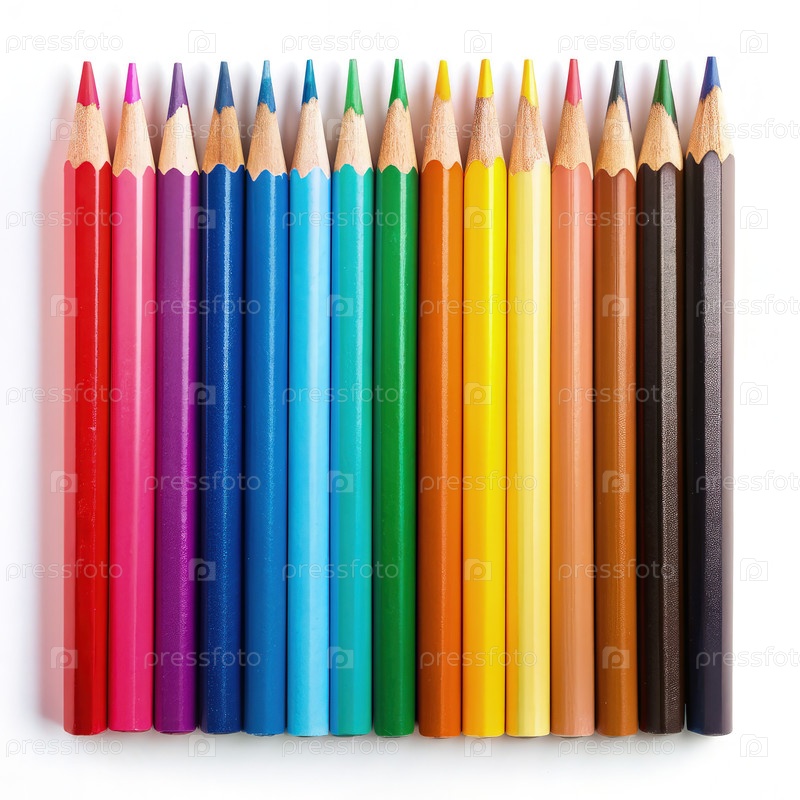 Разнообразный набор цветных карандашей, аккуратно расположенных на чистом белом фоне для творческих проектов