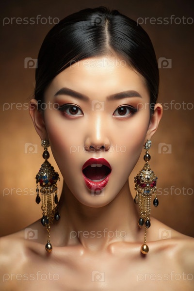 Азиатская девушка с драматическим макияжем и украшенными серьгами на теплом фоне