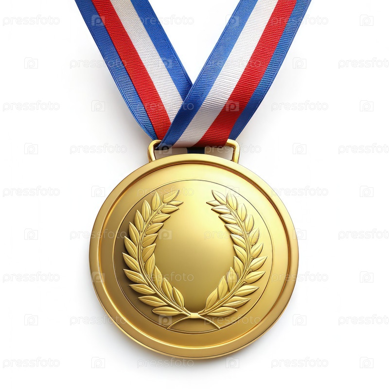 Золотая медаль с лавровым венком на фоне ленты, отмечающей достижения
