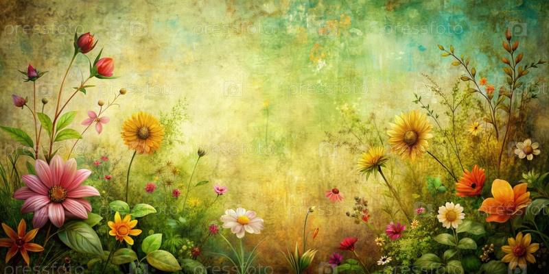 Вибрирующий абстрактный цветочный фон с текстурированным грандж-эффектом, на котором представлены разнообразные цветки в безмятежной и художественной аранжировке