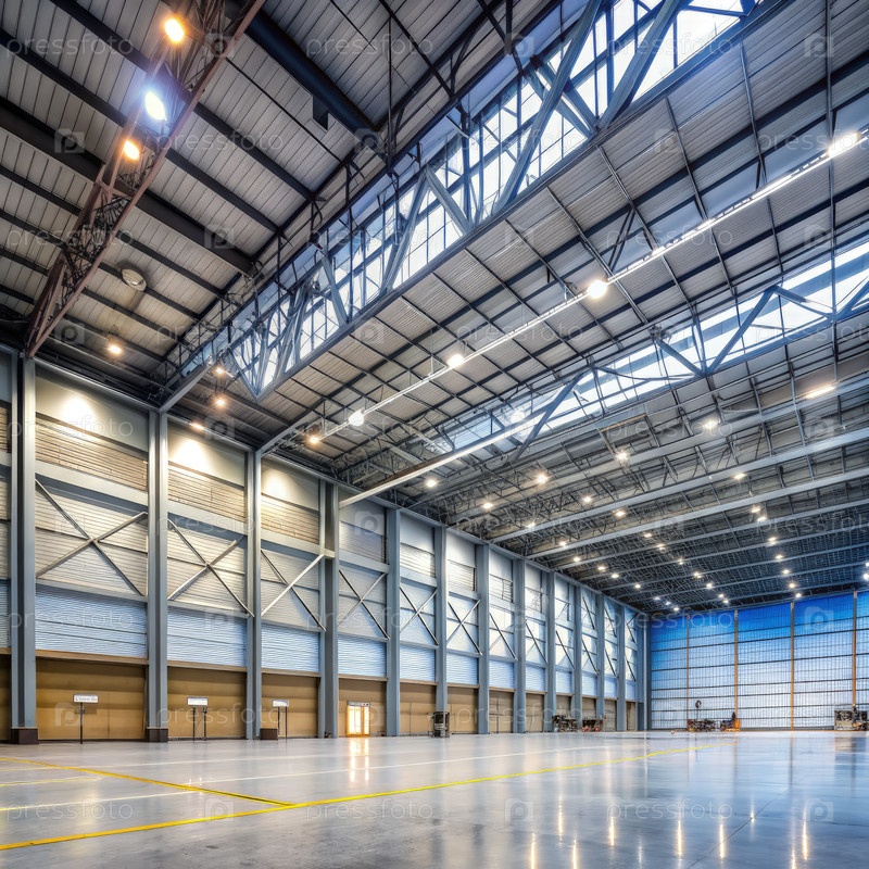 Большой промышленный ангар с высокими потолками и достаточным количеством естественного света в дневное время