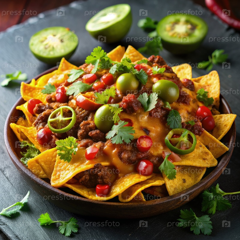 Начо с чили, покрытые халапеносом, помидорами и свежим кориандром, подаются на черной тарелке с известковыми клинками