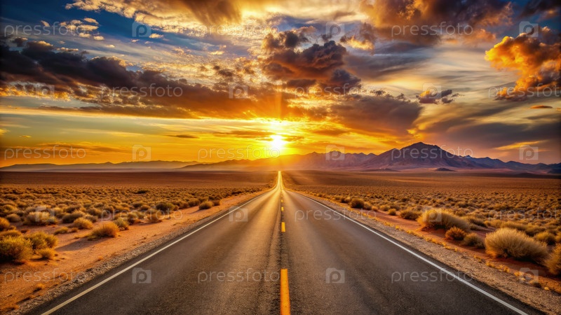 Спокойная пустынная дорога, простирающаяся к величественному закату солнца над горами и облаками