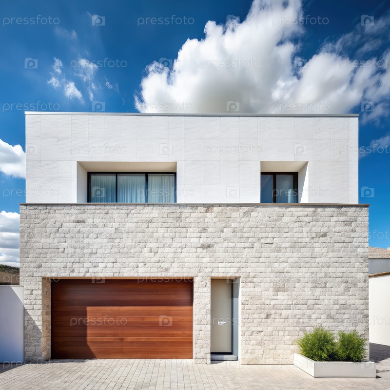 Минималистский фасад с белыми кирпичами и камнями под голубым небом