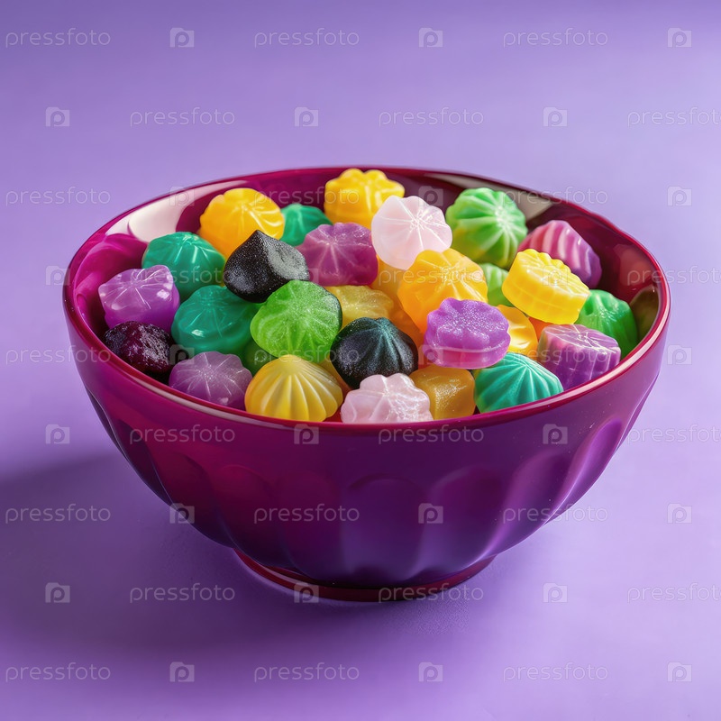 Красочные желатиновые конфеты в фиолетовой миске на ярком фоне