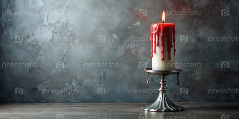 Высокая белая свеча с красным воском, капающим вниз, изящно расположена на серебряном подсвечнике на сером фоне и освещает темную комнату