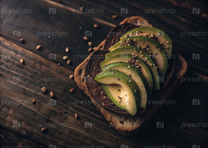 Фрагмент свежеобжаренного хлеба, покрытого яркими кусочками авокадо и рассыпанным семенами, сфотографированный на деревянном фоне для здоровой еды