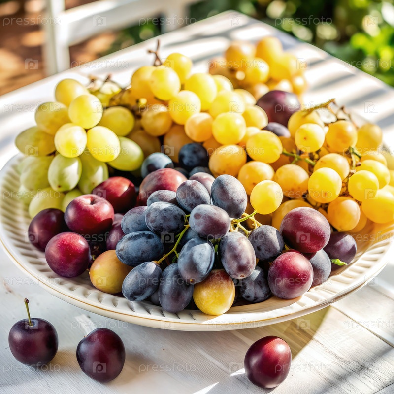 Свежие виноград и сливы на белом столе при естественном свете