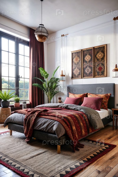 Уютная спальня в стиле бохо с многоуровневыми текстурами и природными элементами в спокойной обстановке