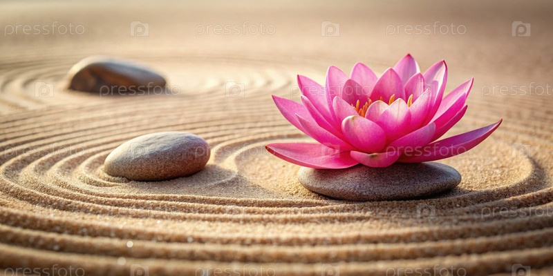 Розовый цветок лотоса с дзен-камнями на вихревых песчаных узорах
