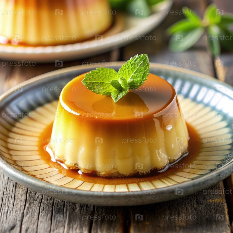 Вкусный кубинский флан подается с карамельным соусом и мятным гарниром в деревенской обстановке