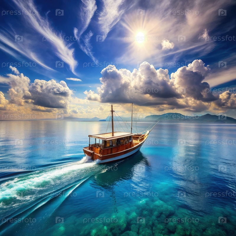 Деревянная лодка спокойно скользит над чистой голубой водой под ярким солнцем, с драматическими облаками и далекими горами на горизонте в тихий день