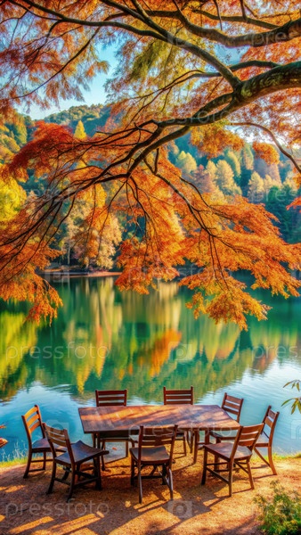 Осенние листья и деревянный стол у спокойной береговой линии озера Данаурц