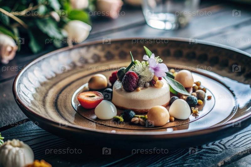 Искренний десерт, украшенный свежими фруктами и нежными цветами, представлен в деревянном столе