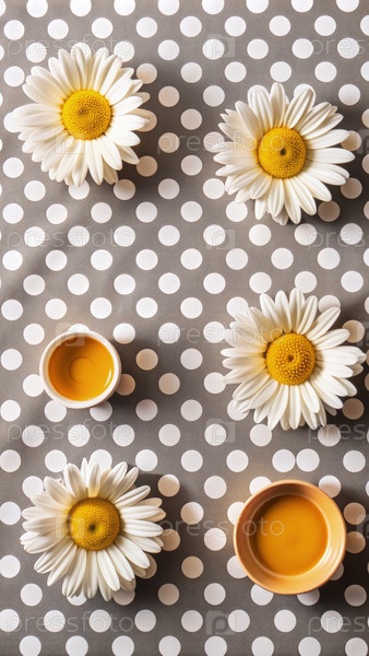 Уютный вечерний чай с деликатными ромашками и яркими кружками травяного чая, расположенных на очаровательной скатерти