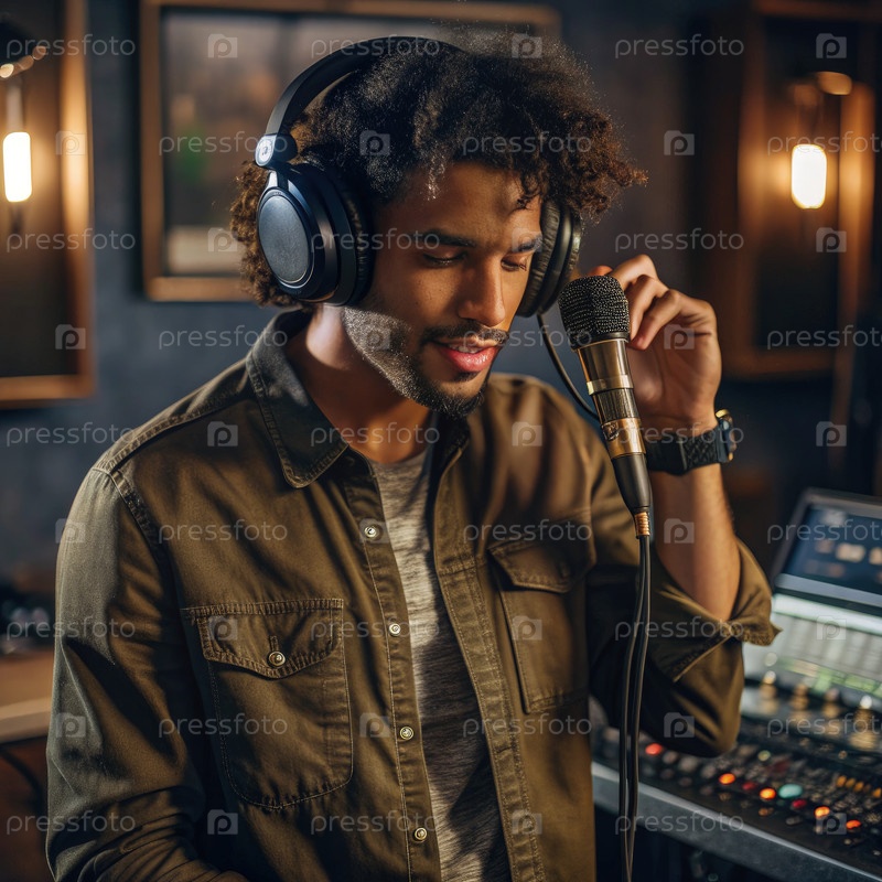 Битмейкер, носящий новые наушники и использующий микрофон, записывает музыку в уютной студии во время вечерней сессии