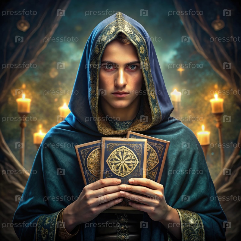 Мистический читатель таро, держащий руны в ритуальной обстановке при свечах