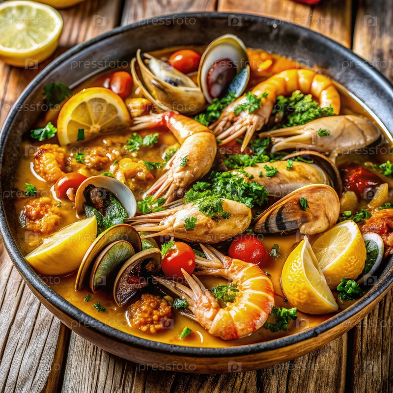 Вкусное блюдо из морепродуктов с креветками, моллюсками и лимоном подается в деревянной миске