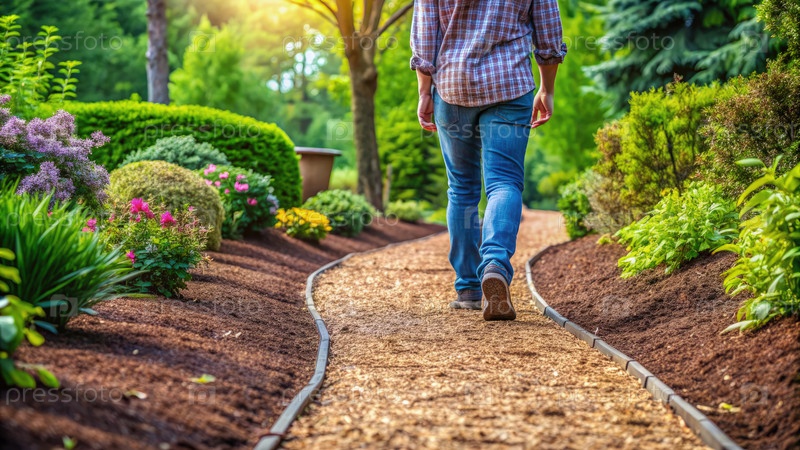 Человек, идущий по садовой тропе в окружении пышной зелени на вечернем свете