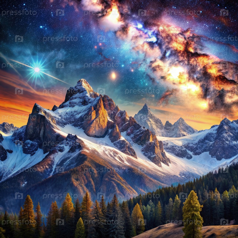 Потрясающий горный пейзаж под звездным ночным небом на закате