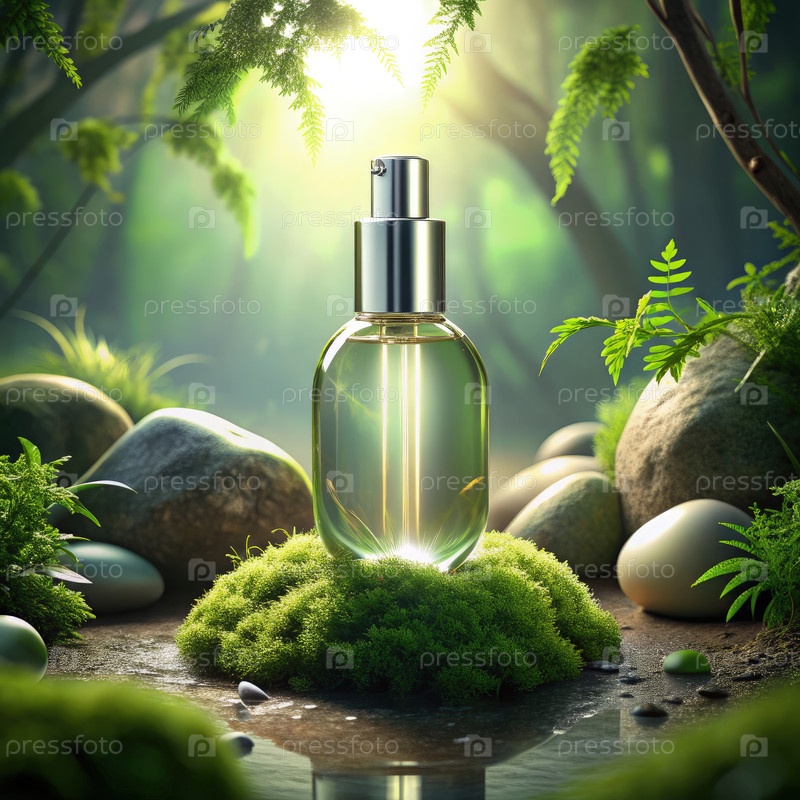 Косметическая бутылка с отражающей поверхностью, помещенная на мох в лесной среде