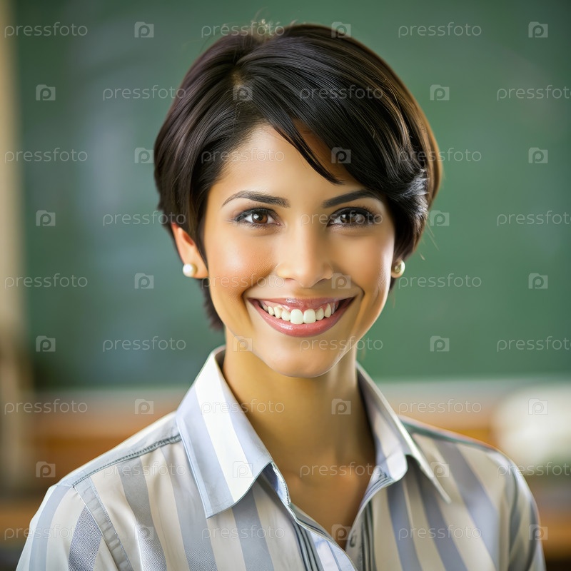 Молодая латиноамериканская учительница с короткими волосами улыбается в классе во время школьного времени