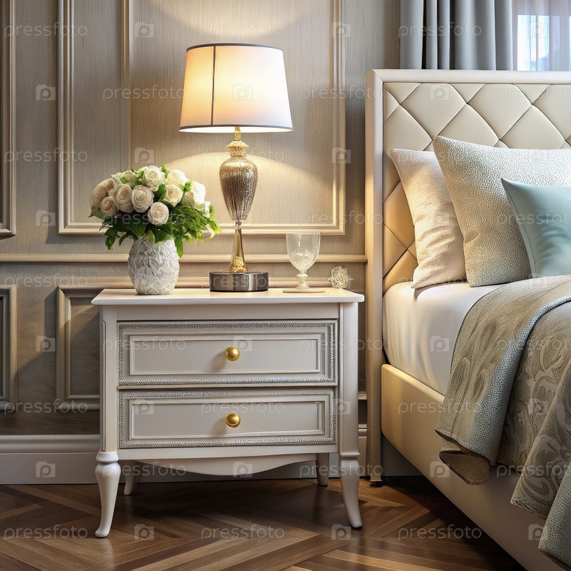 Элегантный ночной стол с лампой и цветами в роскошной обстановке спальни
