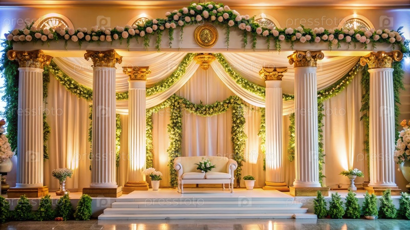 Традиционный греческий тематический христианский свадебный декор с цветочными аранжировками и колоннами