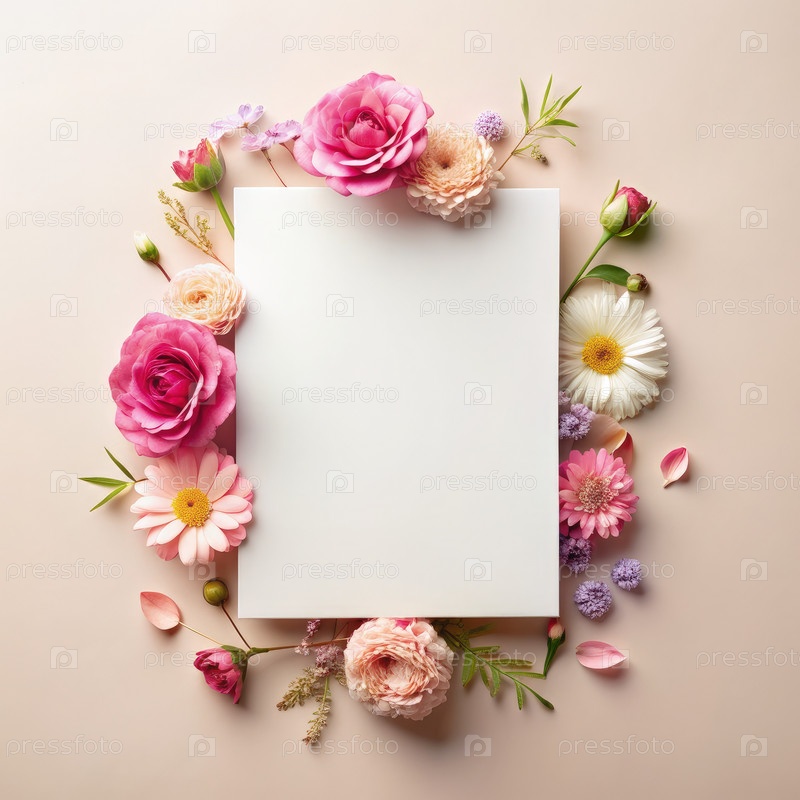 Деликатное расположение цветов, окружающих пустую бумагу на мягком фоне