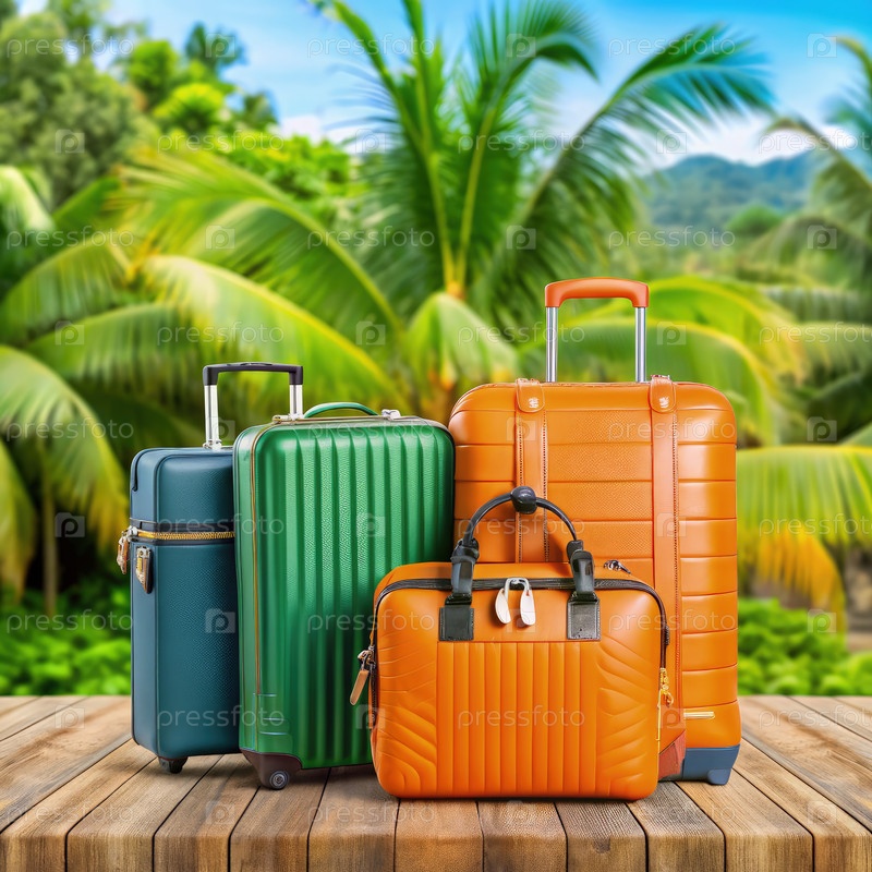Четыре ярких куска багажа, выставленных на деревянном столе среди пышных тропических пальм, идеально подходят для приключений и планирования путешествий