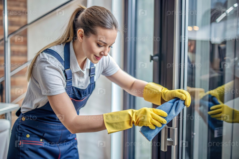 Профессиональная служба уборки выполняет подробную очистку окон желтыми перчатками в современном интерьере днем
