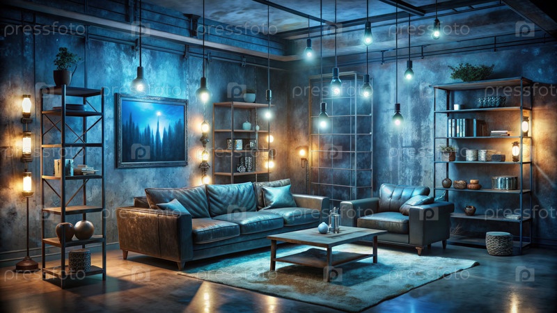 Современная гостиная с несколькими клубными огнями и промышленным декором во время вечерней атмосферы