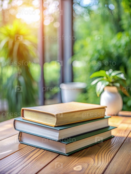 Три книги, лежащие на деревянном столе в солнечном саду