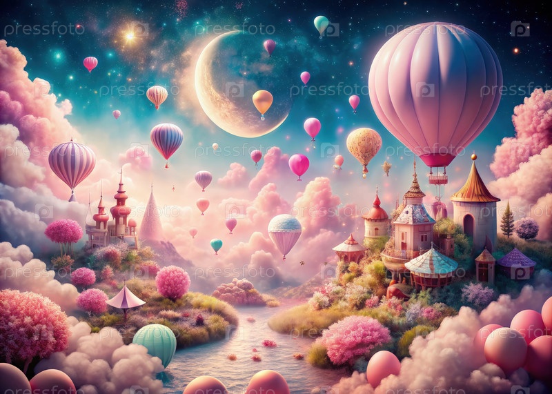 Причудливый пейзаж, наполненный красочными воздушными шарами, поднимающимися над воображаемыми замками и пышным мечтательным ландшафтом в спокойное сумерки