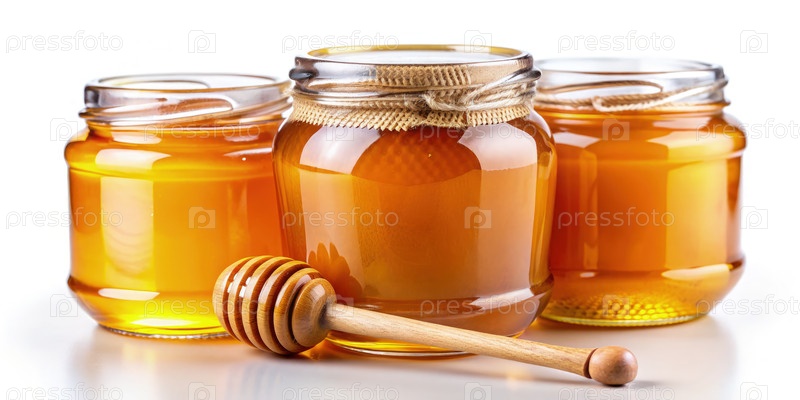 Три банки с медом и деревянным кувшином на белом фоне
