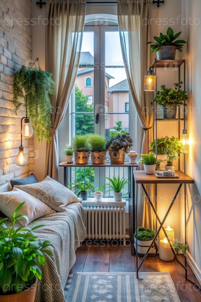 Очаровательная спальня с фальшивым балконом и зеленью, освещаемая теплыми огнями в сумерки