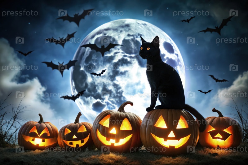 Силуэтированный черный кот с арочной спиной грациозно сидит на резко вырезанном тыкве ночью под полной луной, вокруг которой летают летучие мыши