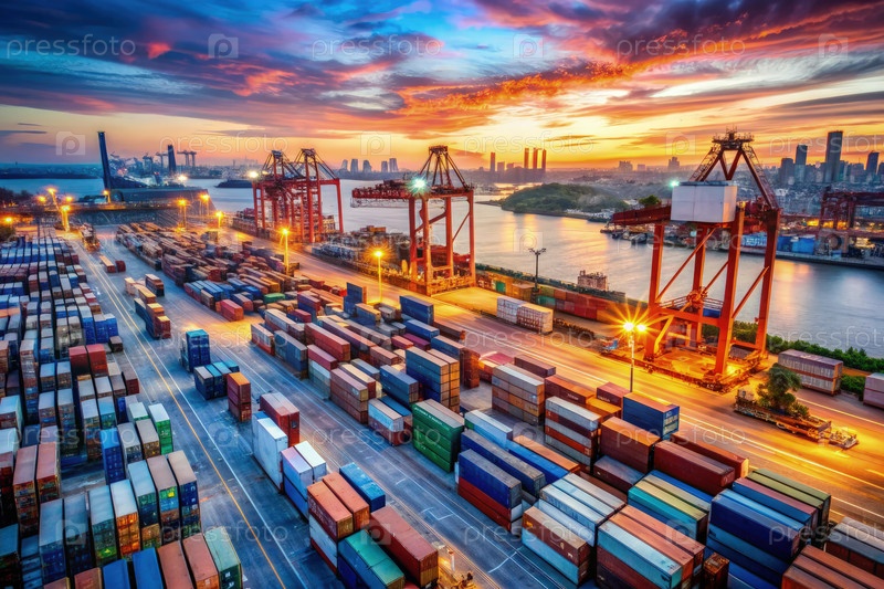 Закат солнца над промышленным портом и контейнерной верфи с кранами
