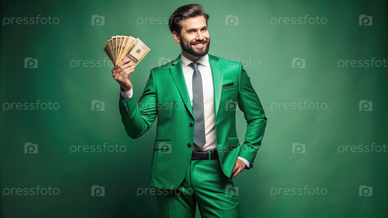 Мужчина в зеленом костюме держит деньги, позируя на зеленом фоне, демонстрируя уверенность и стиль во время профессиональной фотосессии