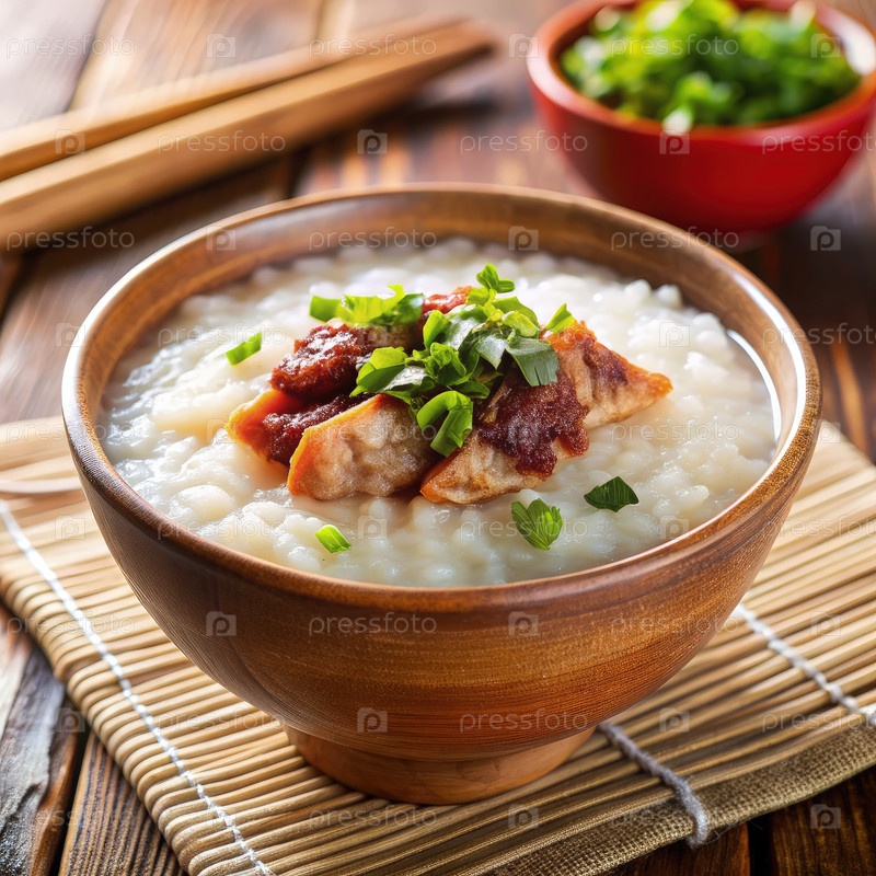 Теплая рисовая каша с мясом и зеленым луком, подаваемая в деревянной таре