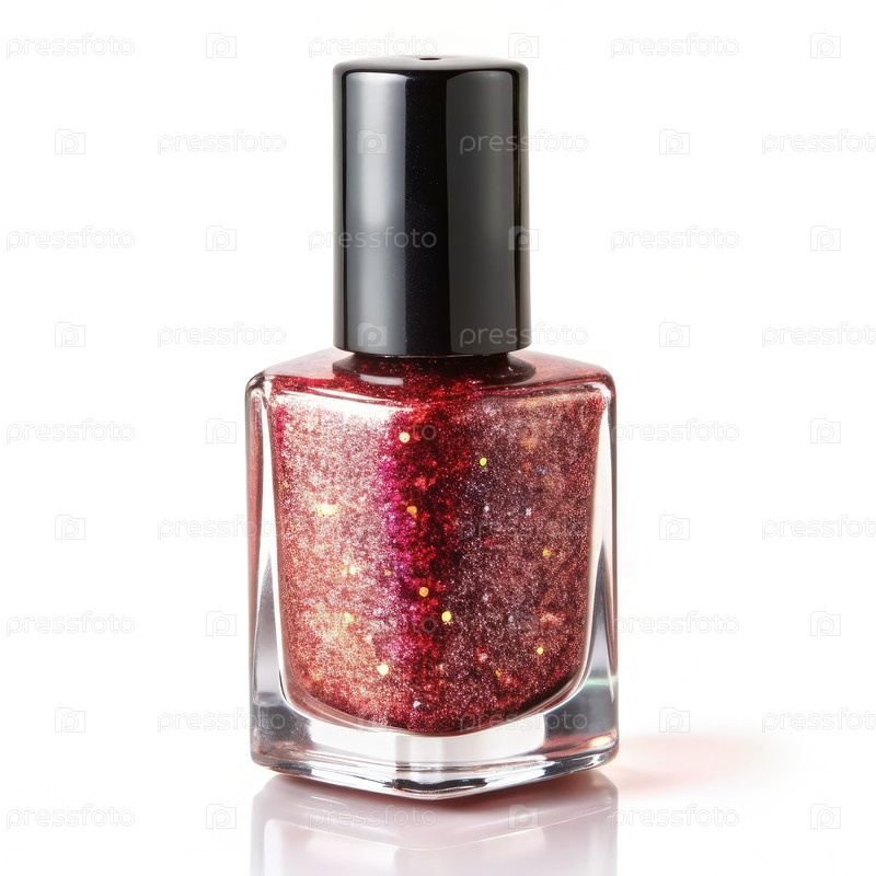 Бутылка с блестящим лаком для ногтей на белом фоне с яркими искрами