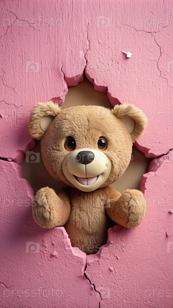 Очаровательный тедди-медведь, проникающий сквозь розовую трещину в стене при ярком освещении