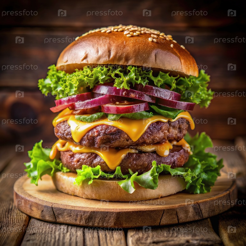 Двойной чизбургер со свежими ингредиентами на деревянном столе