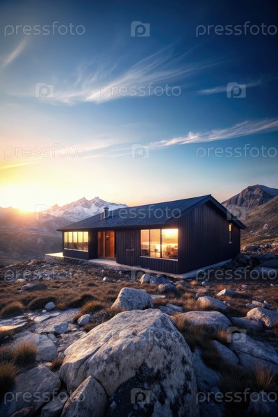 Величественный восход солнца над горным хребтом с уютной хижиной, освещенной ранним утренним светом среди скалистой местности