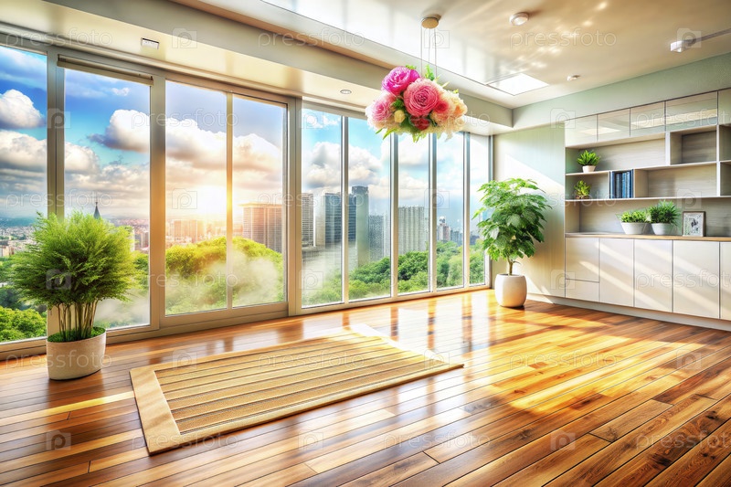 Яркое жилое пространство с большими окнами и цветочным декором с видом на яркий городской горизонт при закате