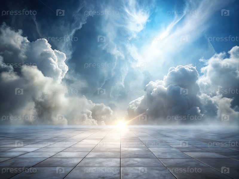 Абстрактное изображение спокойного пейзажа с белой мраморной тропинкой, освещенной яркими облаками и солнечным светом на рассвете