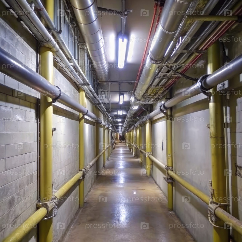 Длинный коридор с желтыми и серыми трубами под ярким потолочным освещением