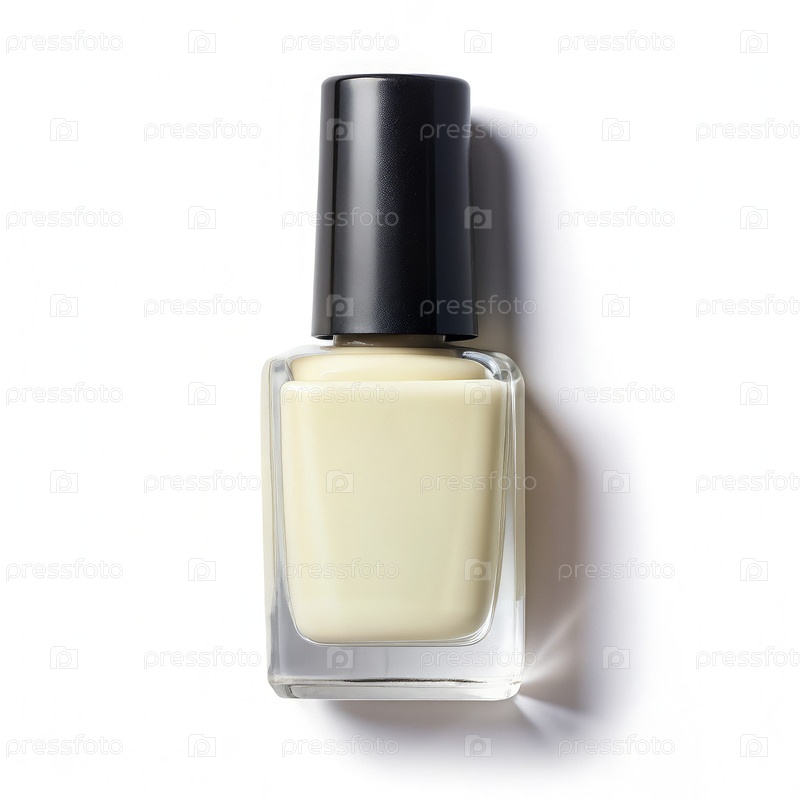 Вид сверху бледной бутылки полировки, опирающейся на белую поверхность, демонстрируя ее мягкий цвет и изысканный дизайн в минималистической обстановке